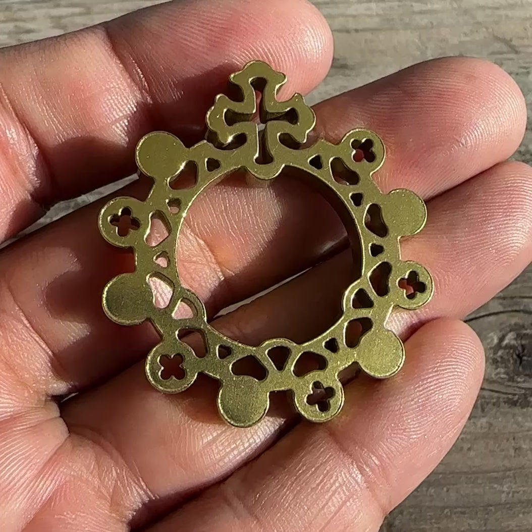 Currently, all Ex Machina Rosaries are cut from 3/16” solid metal by a precision waterjet cutter. Each raw piece is then inspected and sanded by hand to improve the finish before a tumble to soften the edges and burnish to create a luxurious polish. Lastly, each Rosary receives a hand stamped crown logo on a single bead. As with most our products, we like to keep the branding to a minimum as it’s about the prayer not our company.